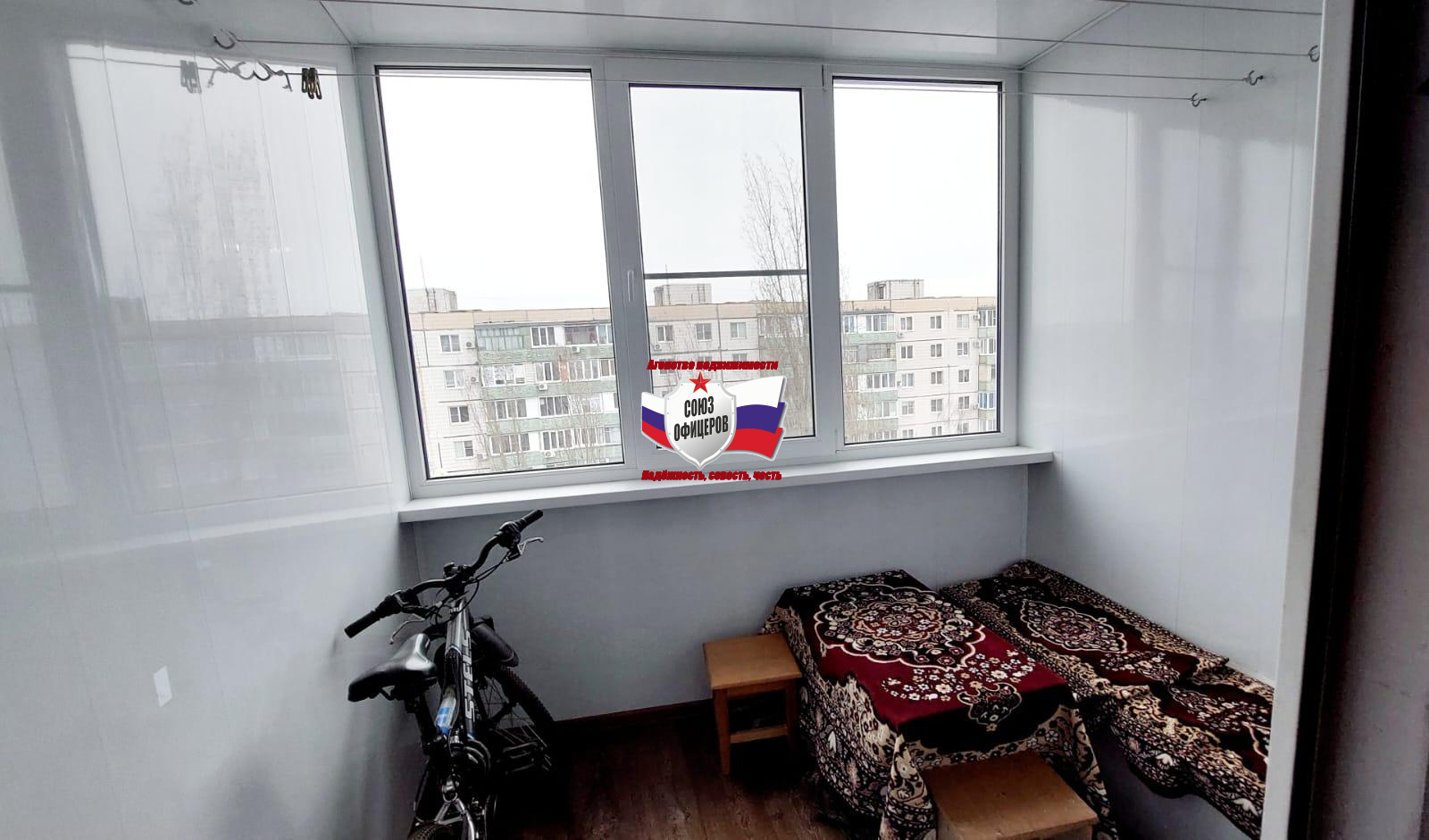 - балкон остеклен ПВХ обшит пластиком проведен свет, на полу- хороший линолеум;